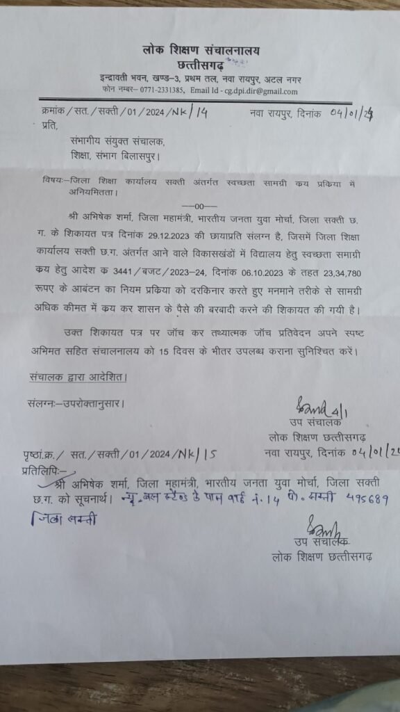 सक्ती — शासन ने सख्त रुख अपनाते हुए स्वच्छता सामग्री क्रय में भारी गड़बड़ी के मामले में तीन विकासखण्ड शिक्षा अधिकारियों पर बड़ी कार्रवाई की है। शिकायत का प्रारंभिक सूत्र भाजपा सक्ती नगर मंडल के महामंत्री अभिषेक शर्मा द्वारा उठाया गया था, जिसकी विस्तार से जाँच के बाद शासन ने माना कि करोड़ों रुपये के बजट वाली प्रक्रिया को विभागीय अधिकारियों ने “मनमर्जी से, बिना गुणवत्ता और बिना नियम पालन” के पूरा किया।