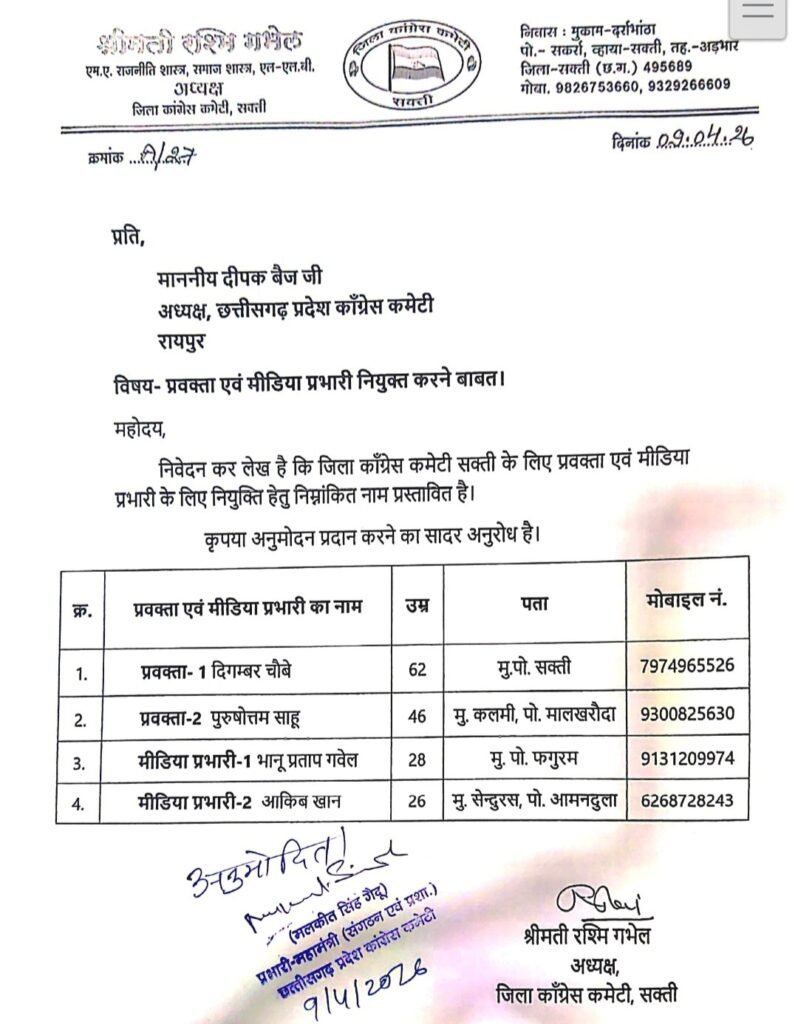 सक्ती-फगुरम। जिला कांग्रेस कमेटी सक्ती द्वारा संगठन को और अधिक मजबूत एवं सक्रिय बनाने के उद्देश्य से प्रवक्ता एवं मीडिया प्रभारी के पदों के लिए नाम प्रस्तावित किए गए हैं। इस संबंध में जिला कांग्रेस कमेटी की अध्यक्ष श्रीमती रेशम गवेल द्वारा प्रदेश अध्यक्ष माननीय दीपक बैज को पत्र प्रेषित कर अनुमोदन का अनुरोध किया गया है।