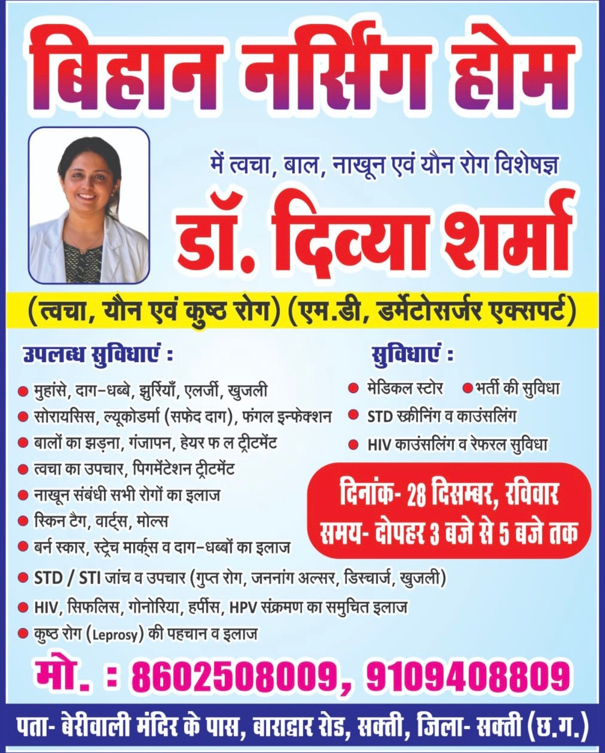 सक्ती। नगर के बिहान नर्सिंग होम में त्वचा, यौन एवं कुष्ठ रोग विशेषज्ञ डॉ. दिव्या शर्मा (एम.डी. डर्मेटोलॉजी एवं एसटीडी) द्वारा मरीजों को विशेषज्ञ परामर्श एवं उपचार सुविधा प्रदान की जा रही है। निजी चिकित्सा संस्थान के रूप में बिहान नर्सिंग होम में यह सेवा नियमित रूप से उपलब्ध है, जिससे क्षेत्र के मरीजों को स्थानीय स्तर पर ही विशेषज्ञ उपचार मिल रहा है।