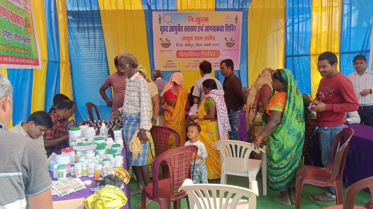 संचालनालय आयुष छत्तीसगढ़ रायपुर एवं जिला आयुष अधिकारी डॉ प्रकाश सिंह के मार्गदर्शन में एवं जिला आयुष नोडल अधिकारी डॉ उत्तम गबेल के निर्देशन एवं डॉ मोहन लाल पटेलआयुर्वेद चिकित्सा अधिकारी हसौद के तत्वाधान मैं आयुष ग्राम हसौद में राष्ट्रीय आयुष मिशन के अंतर्गत एक दिवसीय बृहद निशुल्क स्वास्थ्य जागरूकता एवं चिकित्सा शिविर का आयोजन दिनांक 20 12.2024 को विद्युत नगर हसौद में किया गया ।शिविर का शुभारंभ सरपंच प्रतिनिधि श्री मनबोध साहू एवं हरिशंकर जायसवाल उप सरपंच के द्वारा भगवान धन्वंतरि की पूजा अर्चना कर शुभारंभ किया गया। श्री मनबोध साहू अपने उद्बोधन में आयुर्वेद के प्रति जागरुक करते हुए अधिक से अधिक लोगों को आयुर्वेद शिविर का लाभ लेने के लिए प्रेरित किया गया, साथ ही डॉक्टर विष्णु पटेल आयुर्वेद चिकित्सा अधिकारी एम डी के द्वारा प्रकृति परीक्षण के संबंध में जानकारी देते हुए अधिक से अधिक लोगों को प्रकृति परीक्षण कराने हेतु जागरूक किया गया। शिविर में लगभग 300 से अधिक मरीज का स्वास्थ्य परीक्षण कर निशुल्क औषधि वितरण किया गया। साथ ही 103 लोगों का प्रकृति परीक्षण किया गया शिविर 11:00 बजे प्रारंभ होकर शाम 5:00 बजे तक अनवरत चला रहा ,शिविर में उपस्थित सदस्यों में प्यारेलाल भारद्वाज, श्री बसंत कुमार राय प‌ंच एवं अन्य सदस्य उपस्थित रहे, साथ ही आयुष विभाग हसौद में पदस्थ फार्मासिस्ट निर्मल सिंह राजपूत ओंकार साहू हेमंत राठौड़ फार्मासिस्ट पोरेंद्र भारद्वाज ओमप्रकाश पात्रे, औषधालय सेवक परदेसी भार्गव के साथ-साथ मितानिन ,स्व सहायता समूह के सदस्य एवं आंगनबाड़ी कार्यकर्ता के साथ-साथ अधिक संख्या में नागरिक जन शिविर में उपस्थित रहे, सभी का सहयोग सराहनी रहा।