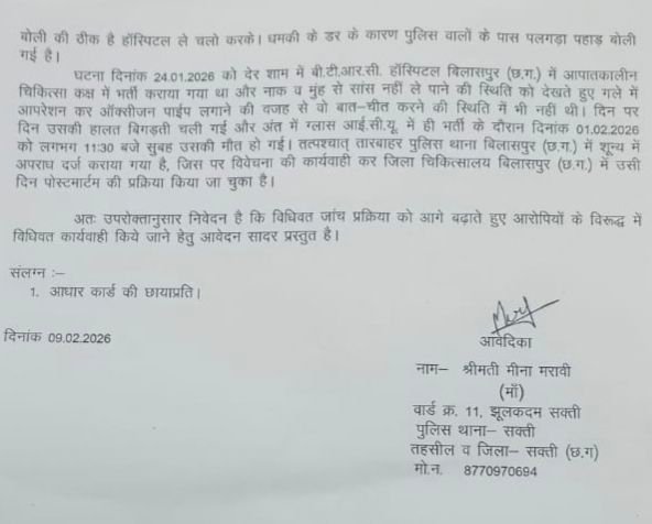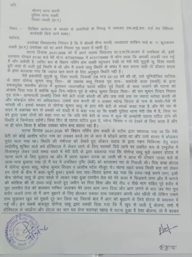वार्ड क्रमांक 11, झूलकदम, सक्ती निवासी श्रीमती मीना मरावी ने पुलिस थाना सक्ती में दिए आवेदन में आरोप लगाया है कि 24 जनवरी 2026 को उनकी पुत्री दिशा मरावी को आरोपी युवक द्वारा फोन कर होटल बुलाया गया। मां का कहना है कि आरोपी पहले से ही उनकी बेटी के संपर्क में था और उस पर मानसिक दबाव बनाता था। आवेदन में उल्लेख है कि घटना वाले दिन दिशा घर से दोपहर करीब 12 बजे निकली थी। कुछ समय बाद उसकी हालत गंभीर होने की सूचना मिली। जब परिजन पहुंचे तो युवती पूरी तरह झुलसी हुई अवस्था में मिली।