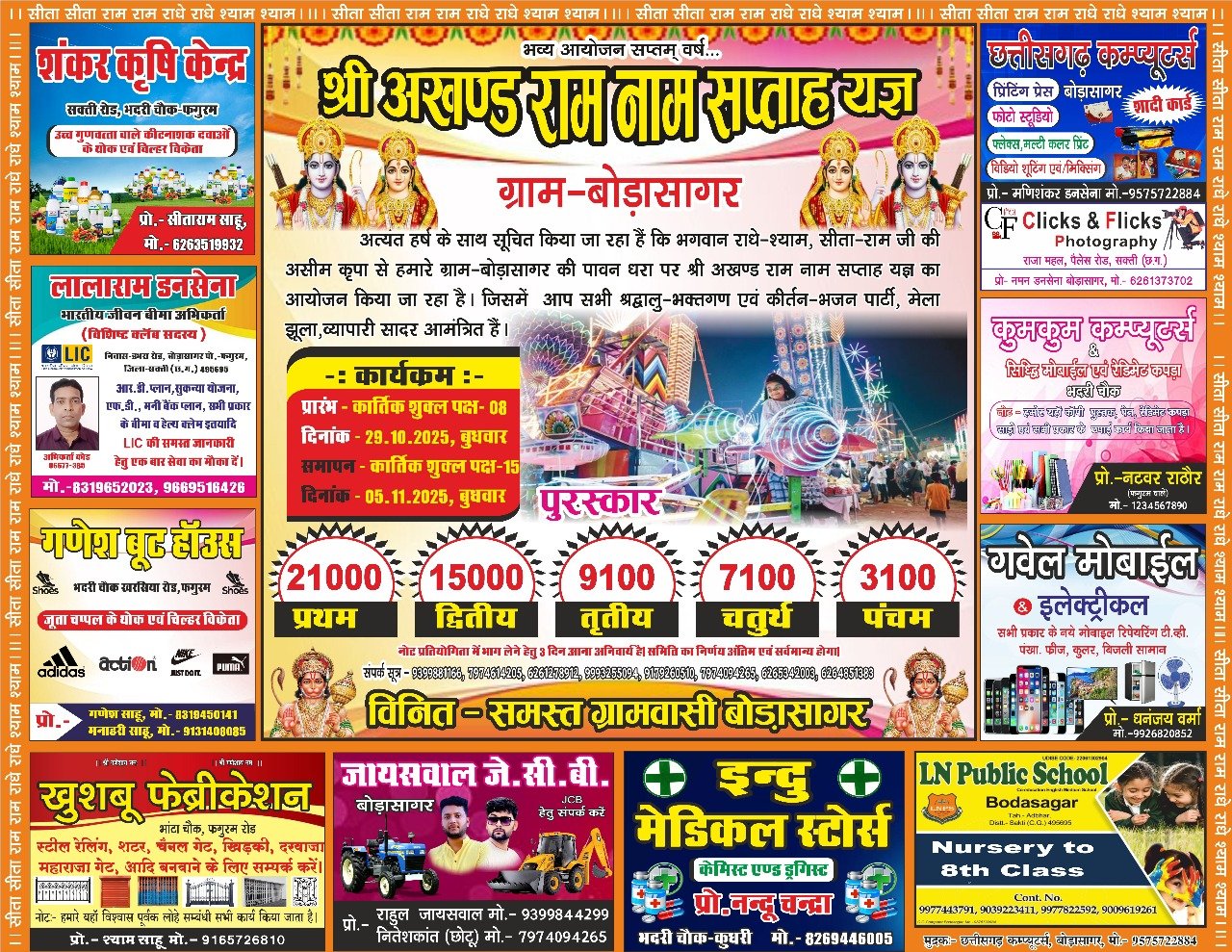बोड़ासागर में 29 अक्टूबर से शुरू होगा श्री अखंड राम नाम सप्ताह यज्ञ, भजन-कीर्तन प्रतियोगिता में विजेताओं को मिलेंगे आकर्षक पुरस्कार, ग्राम में लगेगा भव्य मेला