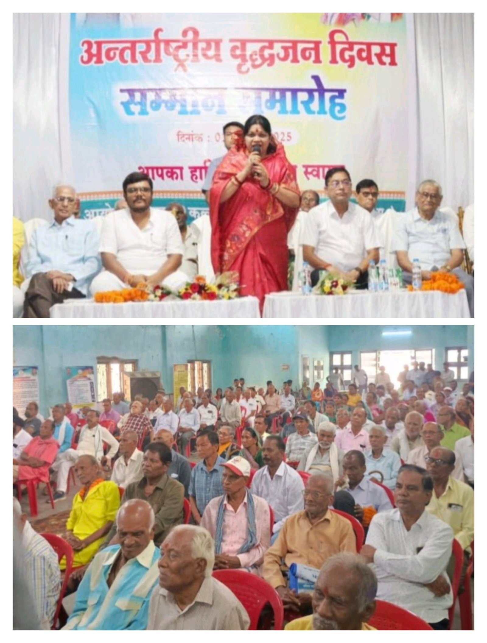 सक्ती। अंतर्राष्ट्रीय वृद्धजन दिवस के अवसर पर आज जिला स्तरीय वृद्धजन सम्मान समारोह एवं स्वास्थ्य शिविर का आयोजन सामुदायिक भवन सक्ती में किया गया। कार्यक्रम में मुख्य अतिथि के रूप में सांसद श्रीमती कमलेश जांगड़े उपस्थित रहीं।